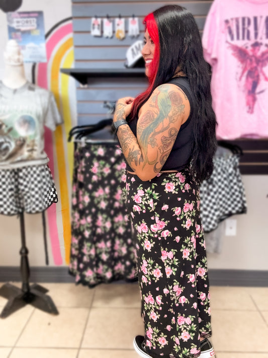 Satin Black Rose Midi Skirt