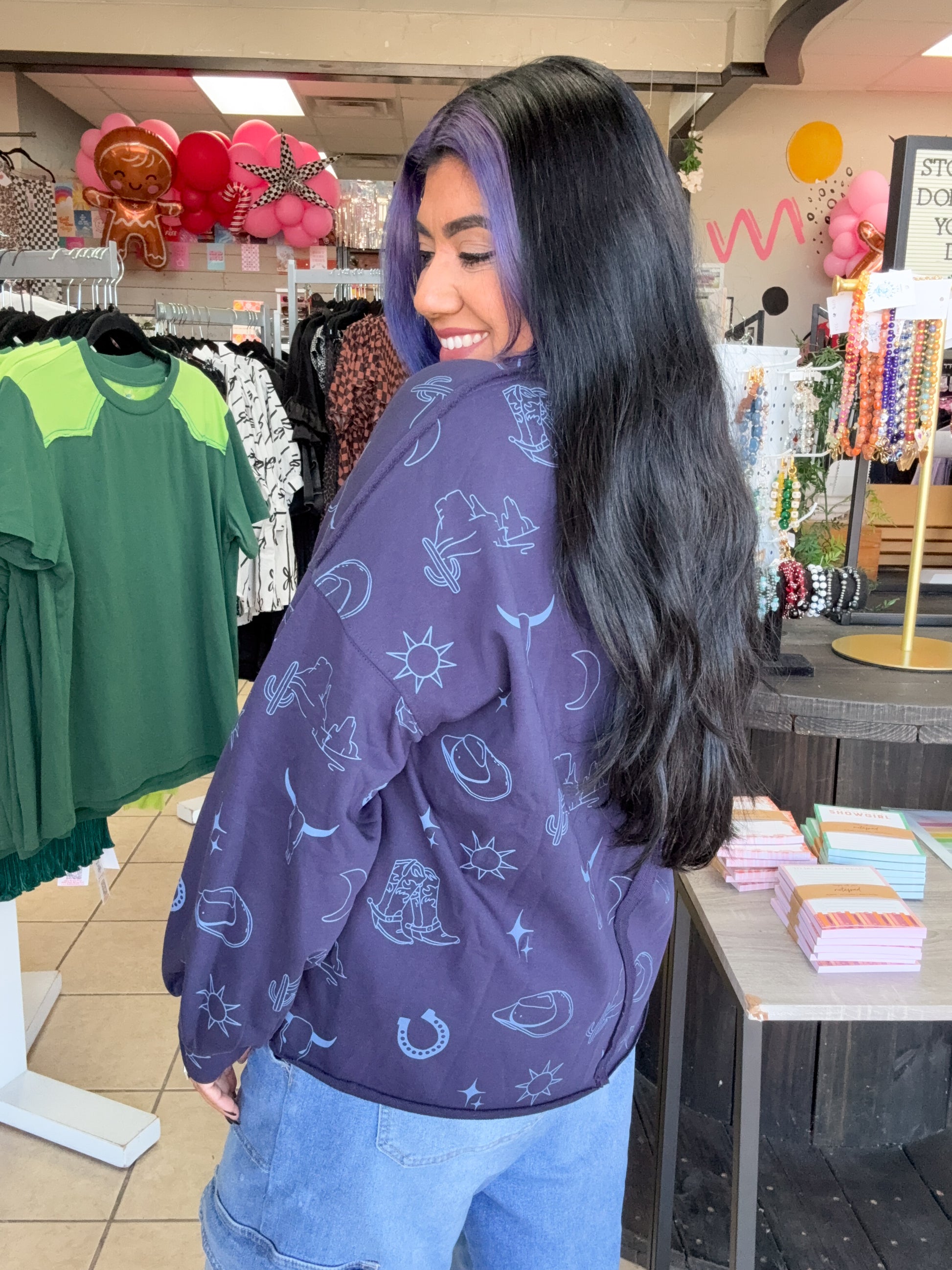 Saddle up in style with the Blue Western Top! This oversized, flowy beauty is like a gentle breeze on a warm day—flattering enough to make you want to twirl like a tumbleweed! The raw hem adds that “I just rolled out of bed but still look fabulous” vibe. Yeehaw!